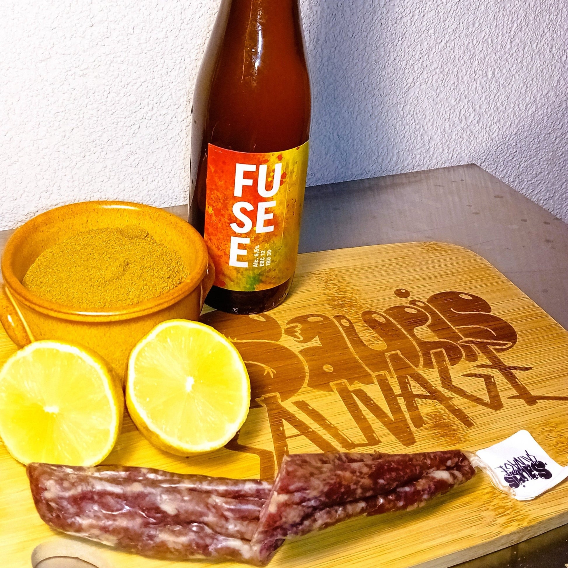 De eerste creatie met Fuséé bier van BAS brouwerij met citrus en komijn. Een heerlijk fris en zomers worstje dat makkelijk weghapt bij de vlot drinkbare Fuséé.